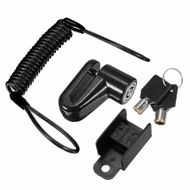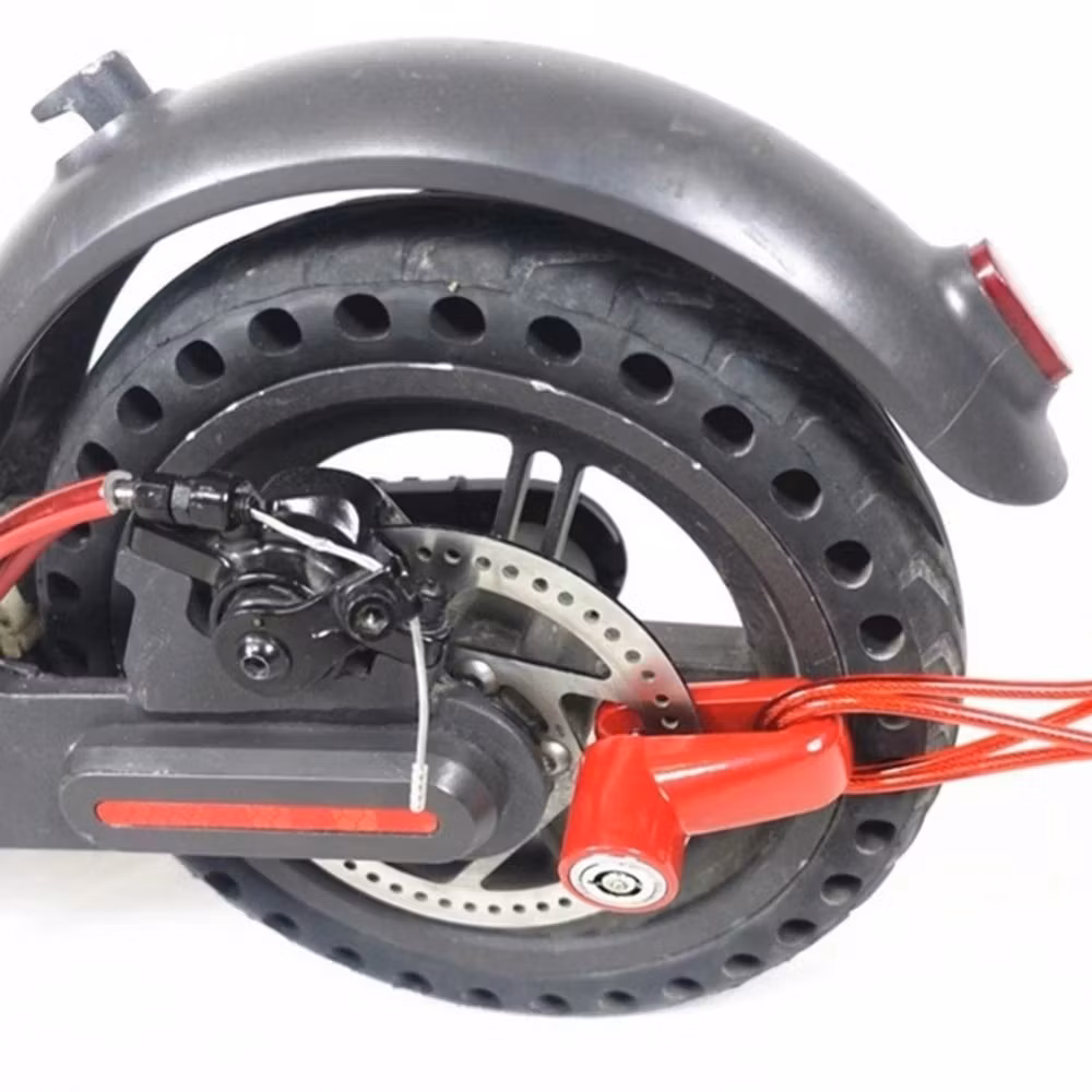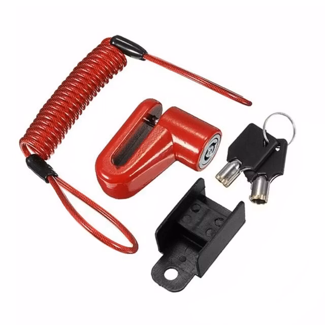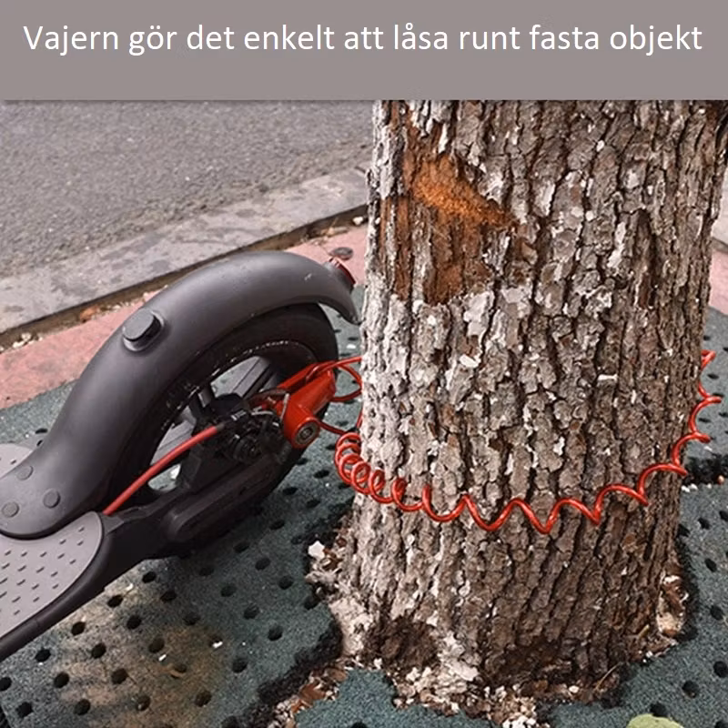 Voit hyvillä mielin jättää sähköskootterisi tai polkupyöräsi vartioimatta, kun teet ostoksia. Tällä sähköskoottreille ja polkupyörille tarkoitetulla vaijerilla varustetulla jarrulevylukolla voit helposti lukita silmäteräsi polkupyörätelineeseen, tolppaan tai muuhun kiinteään kohteeseen mukana tulevalla teräsvaijerilla.