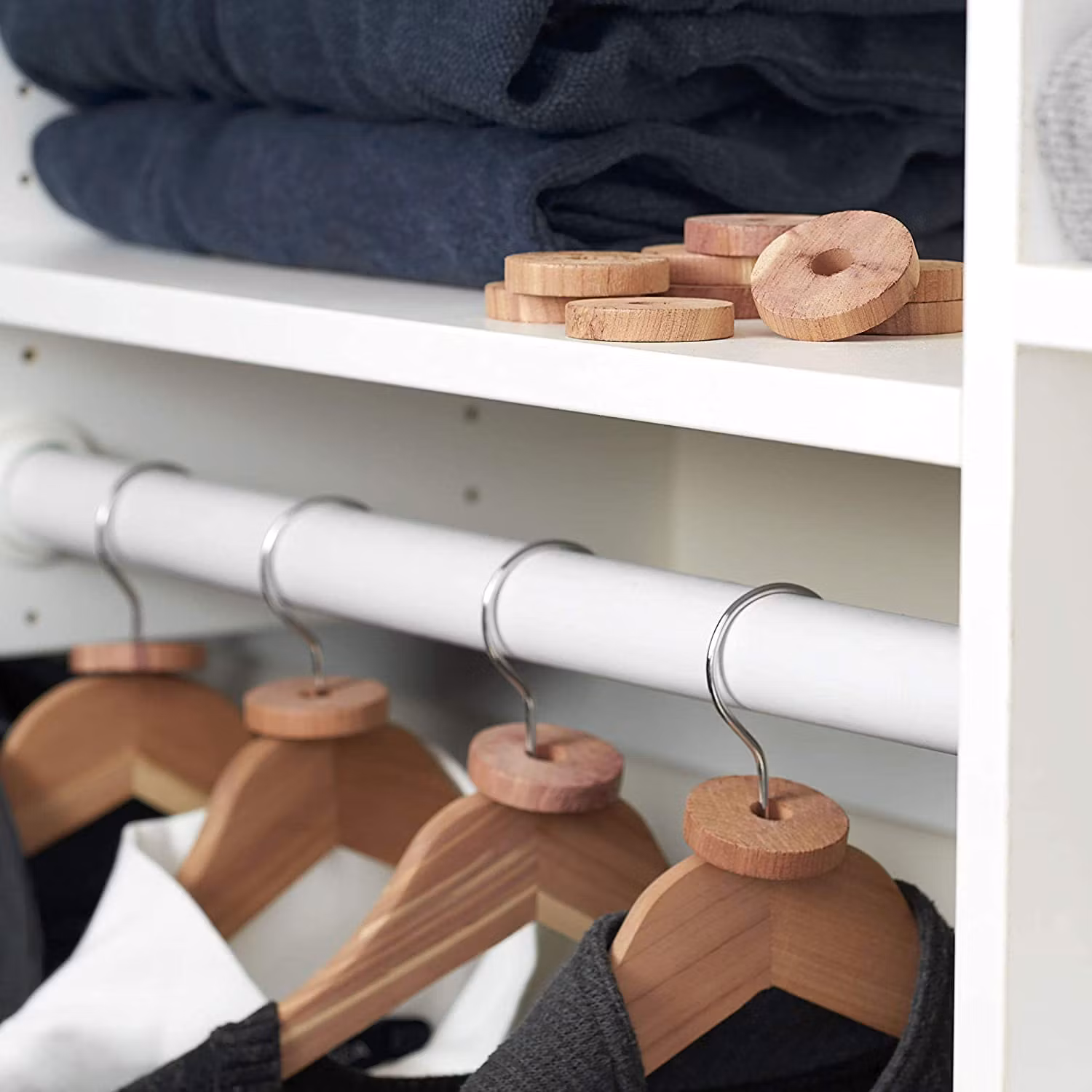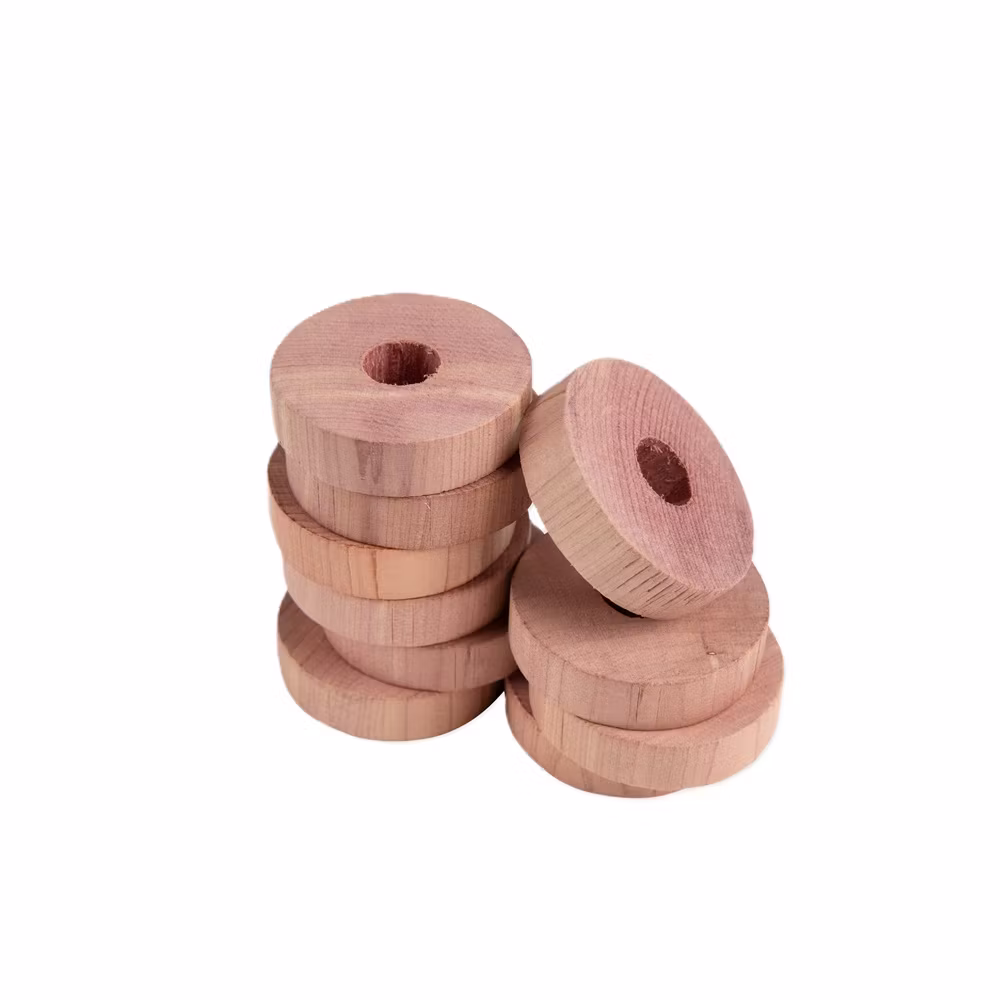 Renkaiden keskellä on reikä, jotta voit helposti pujottaa ne suoraan vaatekaapin henkarien koukkuihin. Setripuurenkaat ovat myös täydellisiä asetettavaksi vaatekaapin hyllylle, lipaston laatikkoon tai tiskialtaan kaappiin luomaan raikkaampaa tuoksua. Pakkaus sisältää 10 setrirengasta.